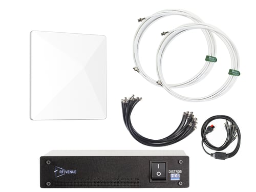 SKU: D-ARCBDISTRO4 - Black Diversity Architectural Antenna, DISTRO4 Antenna Distribution system with (10) BNC jumpers, (4) DC jumpers, and (1) AC power cord Two black 25' RG8X BNC cablesSKU: D-ARCD5 (1) DISTRO5 HDR (1) Diversity Architectural Antenna, white (2) 25' RF Venue Low Loss Antenna Cables, white (1) 10 Pack 1.5' RF Venue Low Loss BNC Interconnect Cables, (1)DC-OCTOPUS-CABLE